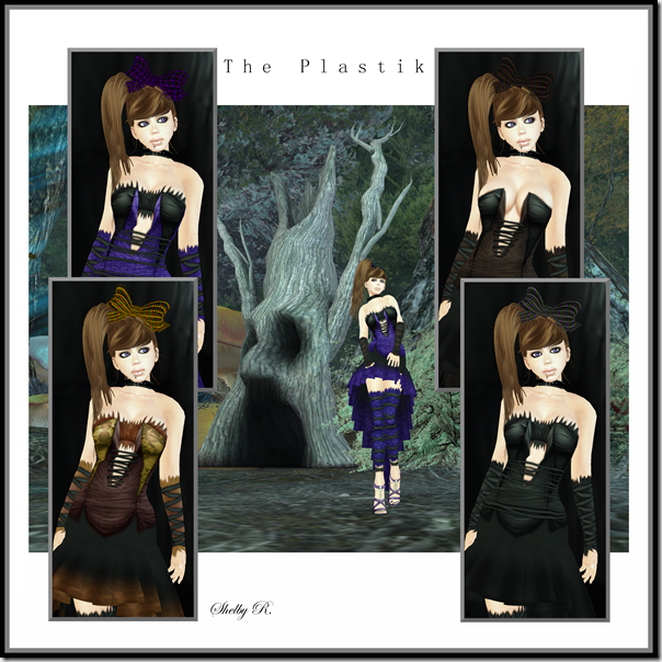 Credits: Dresses The Plastik Ellantha – Black, Violet Vaudeville, Leather, Risen from the flames (many textures available with mix and match styles, prim skirts) 399L {R}, Hair W&Y 5 TypeB, Dreams Gothic Cross Lip rings set 75L {R} (different charms to choose from, colour change), Cloud Buckle Collar, Den-Dou Eyes (midnight blue), Skin Curio Cupid Allure (petal), Shoes Kalnins Sonata (with hud and tex change), Luck Inc. breast enhancer for Curio petal dark. Pics shot @ Bentham Forest.